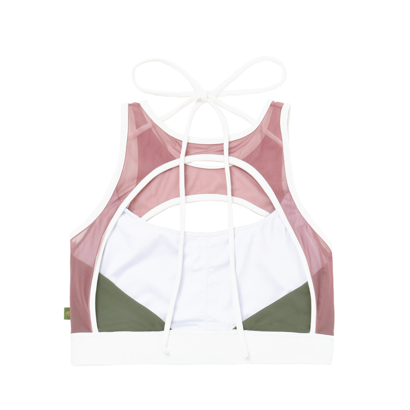 - Mesh layering with a front cut-out for a light yet refined silhouette